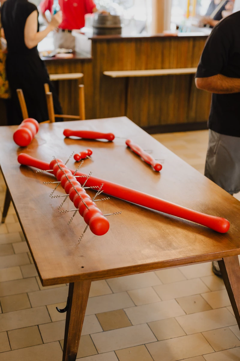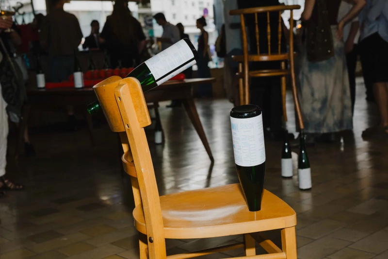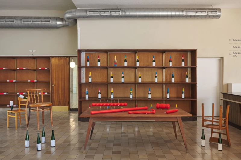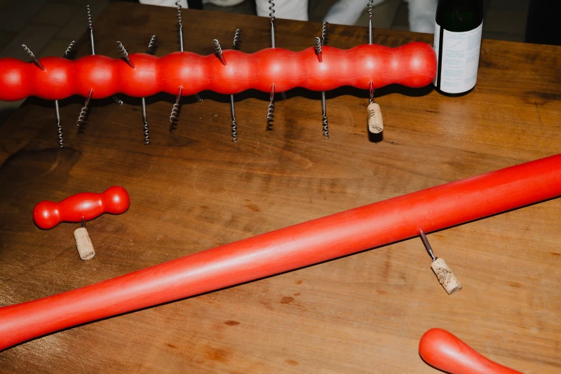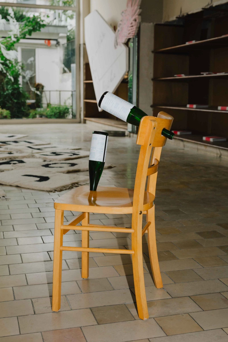 Oliver-Selim Boualam presents "Bis alle weinen", an installation that simultaneously takes the form of a participatory performance. In this work, wine bottles are transformed into poetic objects, each containing a publication of poems reflecting on pleasure, intoxication, and emotional excess. Oversized corkscrews – some measuring over a metre in height – invite collective engagement. The performance element was realised during the opening of the exhibition WeGetCloser 2, when the artist, together with curator Katie Eva Gaj, ceremonially uncorked several bottles of wine.