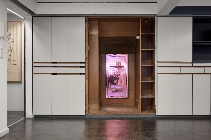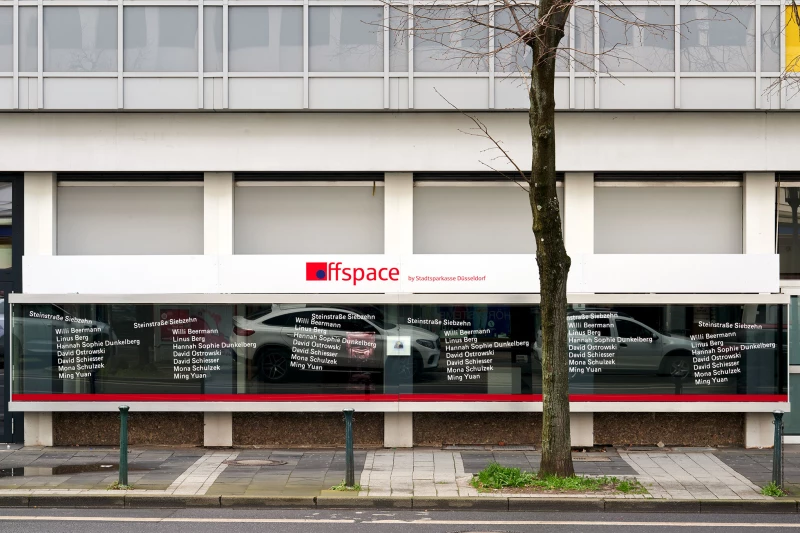 A site-specific intervention featuring artistic positions across diverse media, curated for the former stamp workshop Stempel Baumann, now an off-space of Stadtsparkasse Düsseldorf at Steinstraße 17. Drawing on the site’s history as a space of everyday functional use, the exhibition negotiates its present transformation into a venue for temporary artistic interventions and positions itself as a deliberate inscription into the existing architectural fabric.