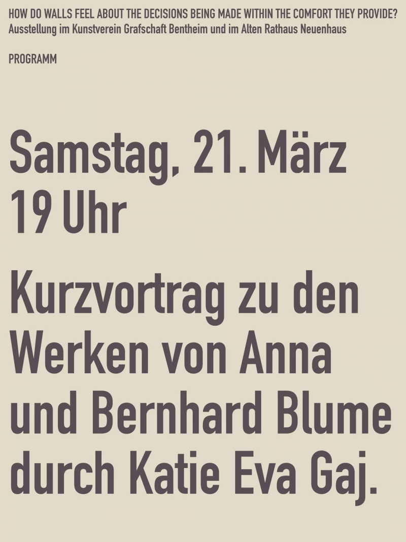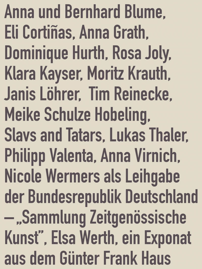 Featuring works by Anna and Bernhard Blume, Eli Cortiñas, Anna Grath, Dominique Hurth, Rosa Joly, Klara Kayser, Moritz Krauth, Janis Löhrer, Tim Reinecke, Meike Schulze Hobeling, Slavs and Tatars, Lukas Thaler, Philipp Valenta, Anna Virnich, and Nicole Wermers, on loan from the Federal Republic of Germany – Contemporary Art Collection, including an exhibit from the Günter Frank House.